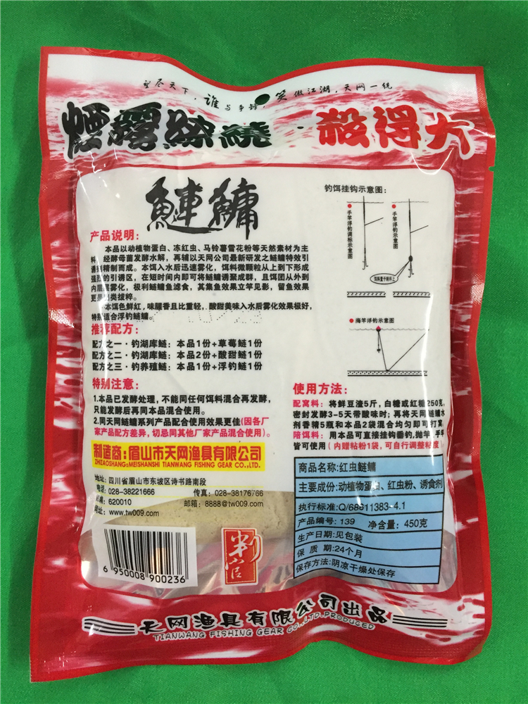 本品以植物蛋白、冻红虫、马铃薯雪花粉等天然素材为主料,经酵母菌发酵水解,再辅以天网公司最新研发之鲢鳙特效引诱剂精制而成。本饵入水之后迅速雾化,饵料做微颗粒从上到下形成强烈的引诱区,在短时间内即可将鲢鳙诱聚成群,且饵团从外到内层层雾化,极利鲢鳙鱼滤食,其集鱼效果立竿见影,留鱼效果更是出类拔萃。